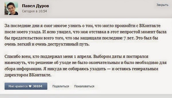 Сам Дуров о своем увольнении узнал из прессы, написал он на своей странице в социальной сети. «Судя по новостям, в результате моего публичного отказа на прошлой неделе сегодня меня уволили с должности генерального директора «ВКонтакте». Интересно, что у акционеров не хватило смелости сделать это прямо, и о своем загадочном увольнении я узнаю из прессы», — пишет он.
