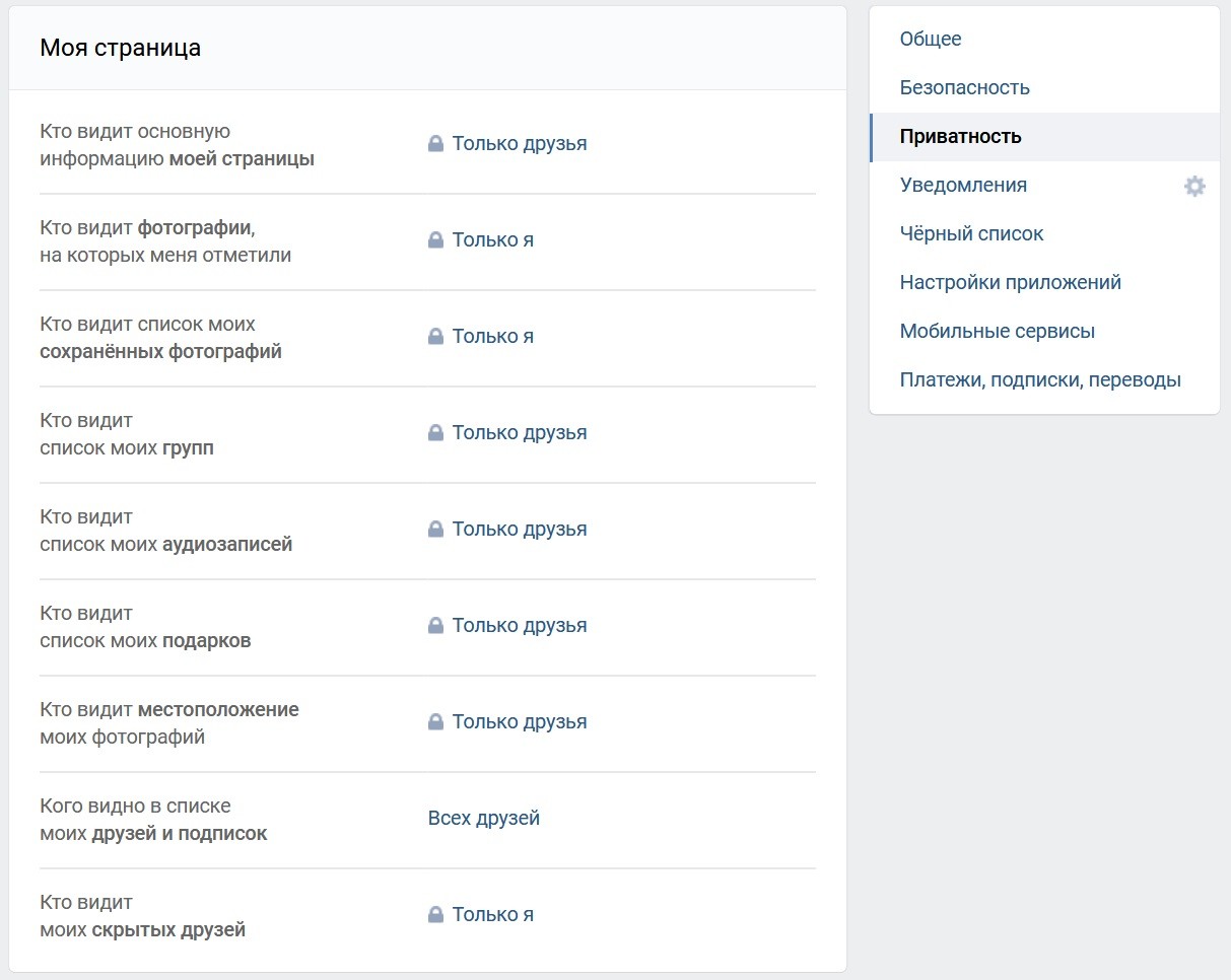 Теперь открываем раздел «Приватность», и идем в блок «Моя страница». Здесь нам нужен параметр «Кого видно в списке моих друзей и подписок».